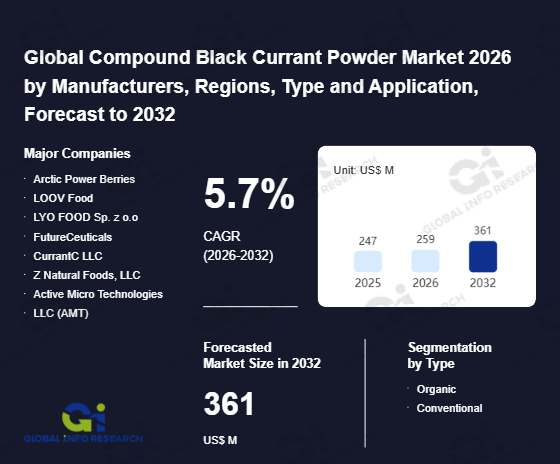 Global Info Research has recently published "Global Compound Black Currant Powder Market 2026 by Manufacturers, Regions, Type and Application, Forecast to 2032". This report systematically analyzes the current status, future trends (2021-2032), and competitive landscape of the global Compound Black Currant Powder market. It provides a quantitative analysis from the perspectives of type (Organic、 Conventional), application (Food、 Beverages、 Personal Care & Cosmetics、 Pharmaceutical、 Dietary Supplements、 Other Applications), regional markets, and major manufacturers (Arctic Power Berries、 LOOV Food、 LYO FOOD Sp. z o.o、 FutureCeuticals、 CurrantC LLC、 Z Natural Foods, LLC、 Active Micro Technologies、 LLC (AMT)、 Waitaki Bio、 ConnOils LLC、 Northwest Wild Foods、 WhitestoneMountain Orchard、 NutriCargo、 Artemis Nutraceutical), comprehensively assessing market opportunities and competitive dynamics.