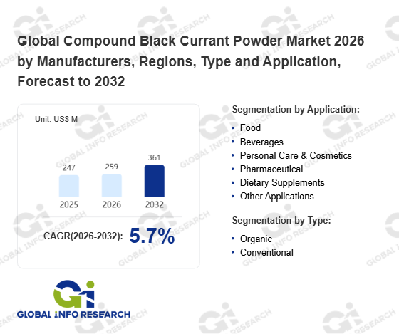 Global Info Research has recently published "Global Compound Black Currant Powder Market 2026 by Manufacturers, Regions, Type and Application, Forecast to 2032". This report systematically analyzes the current status, future trends (2021-2032), and competitive landscape of the global Compound Black Currant Powder market. It provides a quantitative analysis from the perspectives of type (Organic、 Conventional), application (Food、 Beverages、 Personal Care & Cosmetics、 Pharmaceutical、 Dietary Supplements、 Other Applications), regional markets, and major manufacturers (Arctic Power Berries、 LOOV Food、 LYO FOOD Sp. z o.o、 FutureCeuticals、 CurrantC LLC、 Z Natural Foods, LLC、 Active Micro Technologies、 LLC (AMT)、 Waitaki Bio、 ConnOils LLC、 Northwest Wild Foods、 WhitestoneMountain Orchard、 NutriCargo、 Artemis Nutraceutical), comprehensively assessing market opportunities and competitive dynamics.