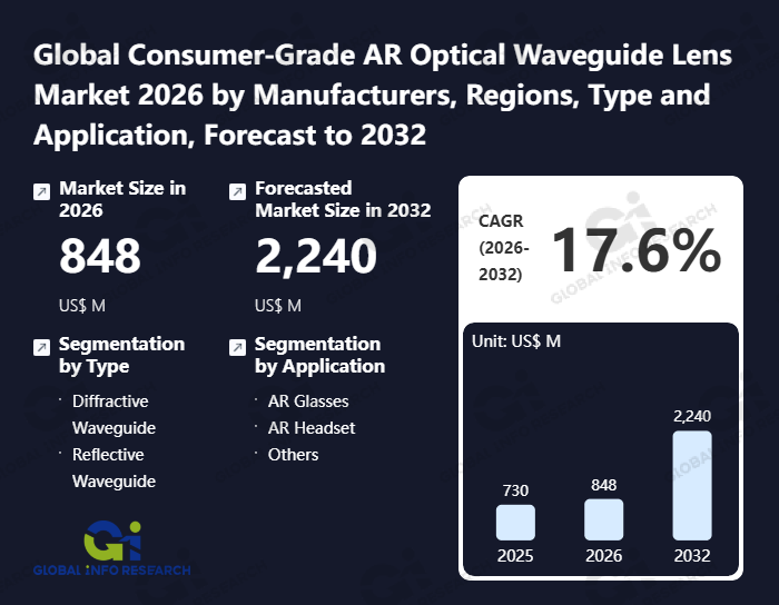 Global Info Research has recently published "Global Consumer-Grade AR Optical Waveguide Lens Market 2026 by Manufacturers, Regions, Type and Application, Forecast to 2032". This report systematically analyzes the current status, future trends (2021-2032), and competitive landscape of the global Consumer-Grade AR Optical Waveguide Lens market. It provides a quantitative analysis from the perspectives of type (Diffractive Waveguide、 Reflective Waveguide), application (AR Glasses、 AR Headset、 Others), regional markets, and major manufacturers (Corning、 Schott、 AGC、 Hoya、 WaveOptics、 Mitsui Chemicals、 SVG Tech、 NedPlus AR、 AAC Technologies、 Zhejiang Crystal-Optech、 Zhuhai Mojie Technology、 Hangzhou Guangli Technology、 Greatar Tech), comprehensively assessing market opportunities and competitive dynamics.