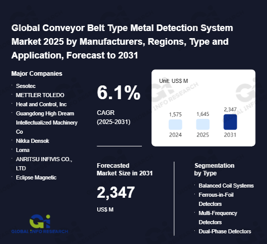 Global Info Research has recently published "Global Conveyor Belt Type Metal Detection System Market 2026 by Manufacturers, Regions, Type and Application, Forecast to 2032". This report systematically analyzes the current status, future trends (2021-2032), and competitive landscape of the global Conveyor Belt Type Metal Detection System market. It provides a quantitative analysis from the perspectives of type (Balanced Coil Systems、 Ferrous-in-Foil Detectors、 Multi-Frequency Detectors、 Dual-Phase Detectors), application (Food、 Pharmaceuticals、 Plastics and Rubber、 Recycling、 Mining、 Other), regional markets, and major manufacturers (Sesotec、 METTLER TOLEDO、 Heat and Control, Inc、 Guangdong High Dream Intellectualized Machinery Co、 Nikka Densok、 Loma、 ANRITSU INFIVIS CO., LTD、 Eclipse Magnetic、 Guangdong Lianzhixin Metal Detection Equipment Co., Ltd、 Mesutronic、 Fortress Technology、 Goring Kerr), comprehensively assessing market opportunities and competitive dynamics.