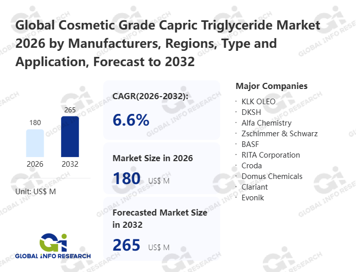 Global Info Research has recently published "Global Cosmetic Grade Capric Triglyceride Market 2026 by Manufacturers, Regions, Type and Application, Forecast to 2032". This report systematically analyzes the global Cosmetic Grade Capric Triglyceride market, providing multi-dimensional insights through type (Content ≤99%、 Content >99%), application (Skin & Sun Care、 Hair Care、 Makeup & Color、 Fragrances & Perfumes), regional markets, and major manufacturers (KLK OLEO、 DKSH、 Alfa Chemistry、 Zschimmer & Schwarz、 BASF、 RITA Corporation、 Croda、 Domus Chemicals、 Clariant、 Evonik), assessing the market status, trend evolution, and competitive landscape impact from 2021 to 2032.
