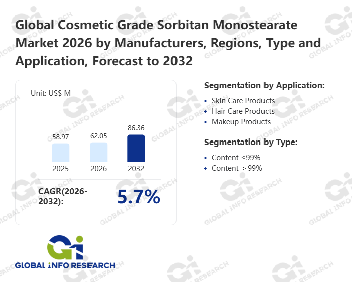 Global Info Research has recently published "Global Cosmetic Grade Sorbitan Monostearate Market 2026 by Manufacturers, Regions, Type and Application, Forecast to 2032". This report systematically analyzes the global Cosmetic Grade Sorbitan Monostearate market, providing multi-dimensional insights through type (Content ≤99%、 Content >99%), application (Skin Care Products、 Hair Care Products、 Makeup Products), regional markets, and major manufacturers (Mohini Organics、 Hangzhou Fuchun Food Additive、 Croda、 Guangzhou Runhua Food Additive、 Triveni Chemicals、 Jeevika Yugchem、 Kao Chemicals), assessing the market status, trend evolution, and competitive landscape impact from 2021 to 2032.