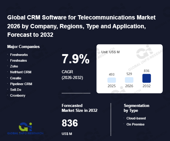 Global Info Research has recently published "Global CRM Software for Telecommunications Market 2026 by Manufacturers, Regions, Type and Application, Forecast to 2032". This report systematically analyzes the current status, future trends (2021-2032), and competitive landscape of the global CRM Software for Telecommunications market. It provides a quantitative analysis from the perspectives of type (Cloud-based、 On Premise), application (Large Telecommunications Companies、 Small and Medium Telecommunications Companies), regional markets, and major manufacturers (Freshworks、 Freshsales、 Zoho、 NetHunt CRM、 Creatio、 Pipeliner CRM、 Sell.Do、 Cronberry、 Solid Performers CRM、 Salesforce、 Oracle、 EngageBay、 Simply CRM、 Hubspot、 Zendesk、 Diyos Infotech、 dovyo CRM、 360 Business Tool), comprehensively assessing market opportunities and competitive dynamics.