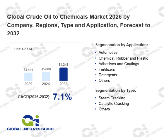 Global Info Research has recently published "Global Crude Oil to Chemicals Market 2026 by Manufacturers, Regions, Type and Application, Forecast to 2032". This report systematically analyzes the current status, future trends (2021-2032), and competitive landscape of the global Crude Oil to Chemicals market. It provides a quantitative analysis from the perspectives of type (Steam Cracking、 Catalytic Cracking、 Others), application (Automotive、 Chemical, Rubber and Plastic、 Adhesives and Coatings、 Fertilizers、 Detergents、 Others), regional markets, and major manufacturers (Aramco、 Hengli Petrochemical、 Sinopec、 RIL、 Saudi Aramco、 SABIC、 S-OIL、 Reliance Industries、 PetroChina、 Zhejiang Petrochemical (ZPC)、 Shenghong Petrochemical、 Yulong Petrochemical、 PETRONAS、 ADNOC、 ExxonMobil、 Shell、 TotalEnergies), comprehensively assessing market opportunities and competitive dynamics.