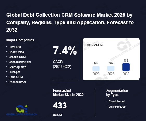 Global Info Research has recently published "Global Debt Collection CRM Software Market 2026 by Manufacturers, Regions, Type and Application, Forecast to 2032". This report systematically analyzes the global Debt Collection CRM Software market, providing multi-dimensional insights through type (Cloud-based、 On Premises), application (Healthcare、 Student Loans、 Financial Services、 Government、 Retail、 Telecom & Utility、 Mortgage & Others), regional markets, and major manufacturers (FiveCRM、 BrightOffice、 Creatio CRM、 CaseTrackerLaw、 LeadSquared、 HubSpot、 Zoho CRM、 PhoneBurner、 receeve、 Ameyo、 Collbox、 Creysto、 ClickUp、 TCN、 Turnkey Lender、 Oracle), assessing the market status, trend evolution, and competitive landscape impact from 2021 to 2032.
