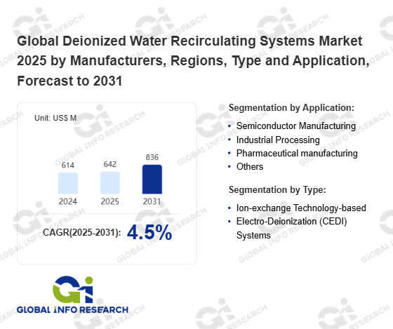 Global Info Research has recently published "Global Deionized Water Recirculating Systems Market 2026 by Manufacturers, Regions, Type and Application, Forecast to 2032". This report systematically analyzes the current status, future trends (2021-2032), and competitive landscape of the global Deionized Water Recirculating Systems market. It provides a quantitative analysis from the perspectives of type (Ion-exchange Technology-based、 Electro-Deionization (CEDI) Systems), application (Semiconductor Manufacturing、 Industrial Processing、 Pharmaceutical manufacturing、 Others), regional markets, and major manufacturers (Evoqua Water Technologies (Xylem)、 Pure Aqua、 Alliance Manufacturing、 DISCO Corporation、 White Knight Fluid Handling (Graco)、 Puretec、 Water Innovations、 Total Water、 KMU LOFT Cleanwater SE、 Advanced Dicing Technologies、 Serv-A-Pure、 CIE、 AllWater Technologies、 Veolia、 SIRCO Industrial、 MARLO、 GE-Osmonics、 IDE Technologies、 BlueGold、 Merck、 Sartorius、 Rotek Water Systems、 Yamato Scientific), comprehensively assessing market opportunities and competitive dynamics.