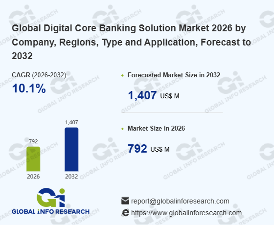 Global Info Research has recently published "Global Digital Core Banking Solution Market 2026 by Manufacturers, Regions, Type and Application, Forecast to 2032". This report systematically analyzes the global Digital Core Banking Solution market, providing multi-dimensional insights through type (Cloud-based Core Banking Solution、 On-Premises Core Banking Solution、 Hybrid Core Banking Solution), application (Retail Banking、 Corporate Banking、 Other), regional markets, and major manufacturers (Mambu、 Advapay、 Intellect Design Arena Limited、 FIS Global、 Thought Machine、 Codebase Technologies、 Intellect Global Consumer Banking (iGCB)、 Kiya.ai、 Finastra、 Temenos、 EdgeVerve、 Alkami、 nCino、 Sopra Banking、 Profile Software、 Huawei、 Sunline、 Fiserv、 Oracle、 Finxact、 BOS Fintech、 Sonali Intellect、 FinHost、 Avaloq Core、 ICS Financial Systems Ltd.、 Galileo Financial Technologies、 Capgemini), assessing the market status, trend evolution, and competitive landscape impact from 2021 to 2032.