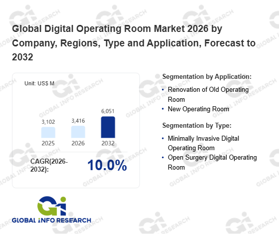 Global Info Research has recently published "Global Digital Operating Room Market 2026 by Manufacturers, Regions, Type and Application, Forecast to 2032". This report systematically analyzes the current status, future trends (2021-2032), and competitive landscape of the global Digital Operating Room market. It provides a quantitative analysis from the perspectives of type (Minimally Invasive Digital Operating Room、 Open Surgery Digital Operating Room), application (Renovation of Old Operating Room、 New Operating Room), regional markets, and major manufacturers (Karl Storz、 Stryker、 Getinge (Maquet)、 Brainlab、 Hillrom、 Barco、 Wei Yi、 Tianlang、 Hisense、 Einstein、 madiston、 Weigao Group、 Mindray Medical、 Likang Medical、 Aeon Medical、 Dashi Jiuxin、 Shangrong Medical、 Pubo Medical、 Aikon (Shanghai)、 Shenzhen Yiwei Ruichuang、 Huafang Yunzhi、 Hansa (Suzhou) Medical Technology Co., Ltd.、 Grand China、 Aerospace Changfeng), comprehensively assessing market opportunities and competitive dynamics.