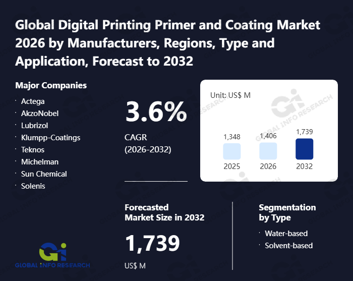 Global Info Research has recently published "Global Digital Printing Primer and Coating Market 2026 by Manufacturers, Regions, Type and Application, Forecast to 2032". This report systematically analyzes the global Digital Printing Primer and Coating market, providing multi-dimensional insights through type (Water-based、 Solvent-based), application (Textiles and Apparel、 Furniture and Wood Products、 Advertising and Commercial Printing、 Packaging Printing、 Other), regional markets, and major manufacturers (Actega、 AkzoNobel、 Lubrizol、 Klumpp-Coatings、 Teknos、 Michelman、 Sun Chemical、 Solenis、 Nirotek、 Polytex Environmental Inks、 Coating & Adhesives Corporation、 Spring Coating Systems、 CHT Group、 Follmann、 INX International Ink、 TIGER Coatings), assessing the market status, trend evolution, and competitive landscape impact from 2021 to 2032.