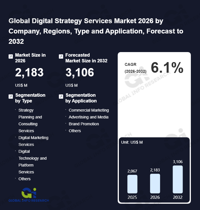 Global Info Research has recently published "Global Digital Strategy Services Market 2026 by Manufacturers, Regions, Type and Application, Forecast to 2032". This report systematically analyzes the global Digital Strategy Services market, providing multi-dimensional insights through type (Strategy Planning and Consulting Services、 Digital Marketing Services、 Digital Technology and Platform Services、 Others), application (Commercial Marketing、 Advertising and Media、 Brand Promotion、 Others), regional markets, and major manufacturers (Accenture、 Aeologic Technologies、 Appnovation、 Bain & Company、 Cognizant、 SoluLab、 Deloitte、 EY、 Huron、 McKinsey & Company、 OMMAX、 SmartOSC), assessing the market status, trend evolution, and competitive landscape impact from 2021 to 2032.