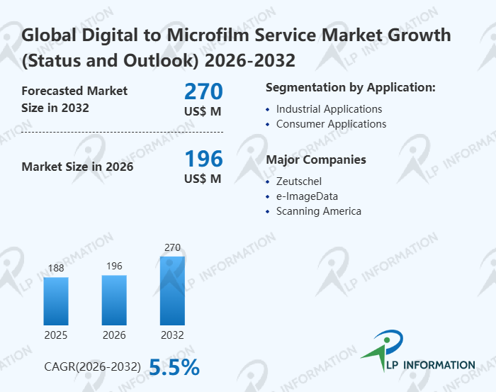 LP Information's latest "Global Digital to Microfilm Service Market Growth 2026-2032" aims to provide a comprehensive assessment of the industry's current status, competitive landscape, future trends, and opportunities. Digital to Microfilm Service report presents readers with a comprehensive, systematic, and forward-looking global keyword market analysis blueprint through a three-dimensional analytical framework: "Data Quantification (Size, Growth Rate, Market Share) + Structural Analysis (Products, Applications, Regions, Competition) + In-Depth Insights (Costs, Channels, Trends)."