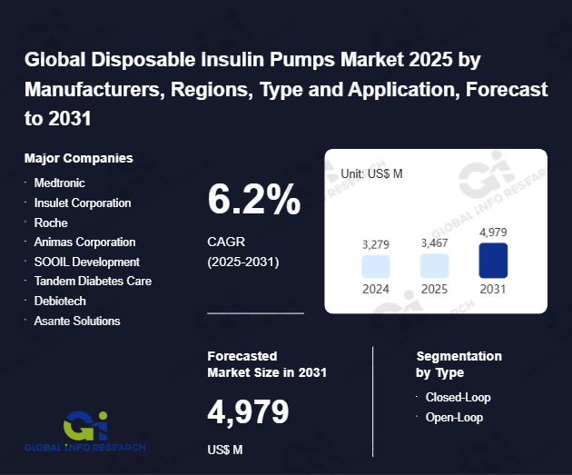 Global Info Research has recently published "Global Disposable Insulin Pumps Market 2026 by Manufacturers, Regions, Type and Application, Forecast to 2032". This report systematically analyzes the global Disposable Insulin Pumps market, providing multi-dimensional insights through type (Closed-Loop、 Open-Loop), application (Hospitals、 Individuals), regional markets, and major manufacturers (Medtronic、 Insulet Corporation、 Roche、 Animas Corporation、 SOOIL Development、 Tandem Diabetes Care、 Debiotech、 Asante Solutions、 Shinmyung Mediyes、 Twobiens、 Top Corporation、 New Genix、 Phray、 Apex Medical、 Fornia), assessing the market status, trend evolution, and competitive landscape impact from 2021 to 2032.