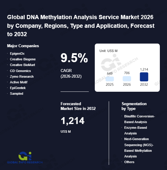 Global Info Research has recently published "Global DNA Methylation Analysis Service Market 2026 by Manufacturers, Regions, Type and Application, Forecast to 2032". This report systematically analyzes the current status, future trends (2021-2032), and competitive landscape of the global DNA Methylation Analysis Service market. It provides a quantitative analysis from the perspectives of type (Bisulfite Conversion-Based Analysis、 Enzyme-Based Analysis、 Next-Generation Sequencing (NGS)-Based Methylation Analysis、 Others), application (Oncology、 Neurology、 Immunology、 Others), regional markets, and major manufacturers (EpigenDx、 Creative Biogene、 Creative BioMart、 CD Genomics、 Zymo Research、 Active Motif、 EpiGentek、 Sampled、 Hologic Diagenode、 CeGaT、 Génome Québec、 Celemics、 Epistem、 Wasatch Biolabs、 EpiGenie、 Azenta Life Sciences), comprehensively assessing market opportunities and competitive dynamics.