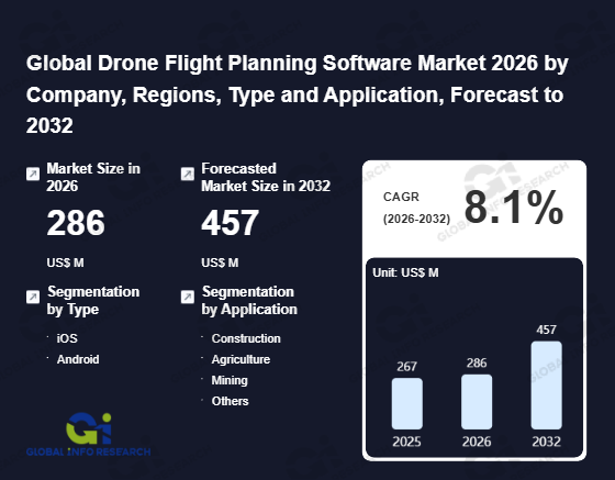 Global Info Research has recently published "Global Drone Flight Planning Software Market 2026 by Manufacturers, Regions, Type and Application, Forecast to 2032". This report systematically analyzes the global Drone Flight Planning Software market, providing multi-dimensional insights through type (iOS、 Android), application (Construction、 Agriculture、 Mining、 Others), regional markets, and major manufacturers (DJIFlightPlanner、 SPH Engineering、 Pix4D、 Dronelink、 Drone Harmony、 Draganfly、 Mapware、 Litchi、 Airware, Inc.、 3D Robotics、 Dreamhammer Inc.、 Drone Volt、 Dronedeploy Inc.、 7ESRI、 Precisionhawk Inc.、 Sensefly Ltd.、 Skyward Io、 Delta Drone、 AeroVironment、 VIATechnik), assessing the market status, trend evolution, and competitive landscape impact from 2021 to 2032.