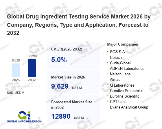 Global Info Research has recently published "Global Drug Ingredient Testing Service Market 2026 by Manufacturers, Regions, Type and Application, Forecast to 2032". This report systematically analyzes the global Drug Ingredient Testing Service market, providing multi-dimensional insights through type (Veterinary Drug Testing、 Drug Testing、 Pesticide Testing), application (Drug Research and Development、 Quality Control、 Clinical Research、 Drug Supervision、 Others), regional markets, and major manufacturers (SGS S.A.、 Cotecn、 Curia Global、 ADPEN Laboratories、 Nelson Labs、 Almac、 Q Laboratories、 Creative Proteomics、 Eurofins Scientific、 CPT Labs、 Evans Analytical Group、 Vetter Pharma、 Tentamus Group、 Contract Laboratory、 Auriga Research), assessing the market status, trend evolution, and competitive landscape impact from 2021 to 2032.