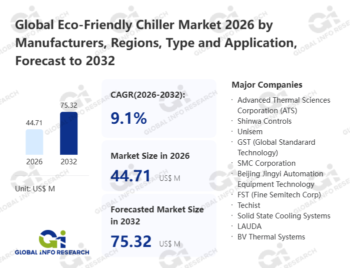 Global Info Research has recently published "Global Eco-Friendly Chiller Market 2026 by Manufacturers, Regions, Type and Application, Forecast to 2032". This report systematically analyzes the global Eco-Friendly Chiller market, providing multi-dimensional insights through type (Single Channel、 Dual Channel、 Three Channel), application (Automotive、 Food & Beverage、 Semiconductor、 Others), regional markets, and major manufacturers (Advanced Thermal Sciences Corporation (ATS)、 Shinwa Controls、 Unisem、 GST (Global Standarard Technology)、 SMC Corporation、 Beijing Jingyi Automation Equipment Technology、 FST (Fine Semitech Corp)、 Techist、 Solid State Cooling Systems、 LAUDA、 BV Thermal Systems、 Legacy Chiller、 Noah Precision、 CJ Tech Inc、 STEP SCIENCE、 Thermonics (inTEST Thermal Solutions)、 TopChiller), assessing the market status, trend evolution, and competitive landscape impact from 2021 to 2032.