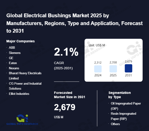 Global Info Research has recently published "Global Electrical Bushings Market 2026 by Manufacturers, Regions, Type and Application, Forecast to 2032". This report systematically analyzes the global Electrical Bushings market, providing multi-dimensional insights through type (Oil Impregnated Paper (OIP)、 Resin Impregnated Paper (RIP)、 Others), application (Utilities、 Industries、 Others), regional markets, and major manufacturers (ABB、 Siemens、 GE、 Eaton、 Nexans、 Bharat Heavy Electricals Limited、 CG Power and Industrial Solutions、 Elliot Industries、 Gamma、 Gipro GmbH、 Hubbell、 Polycast International、 RHM International、 Toshiba、 Webster-Wilkinson), assessing the market status, trend evolution, and competitive landscape impact from 2021 to 2032.