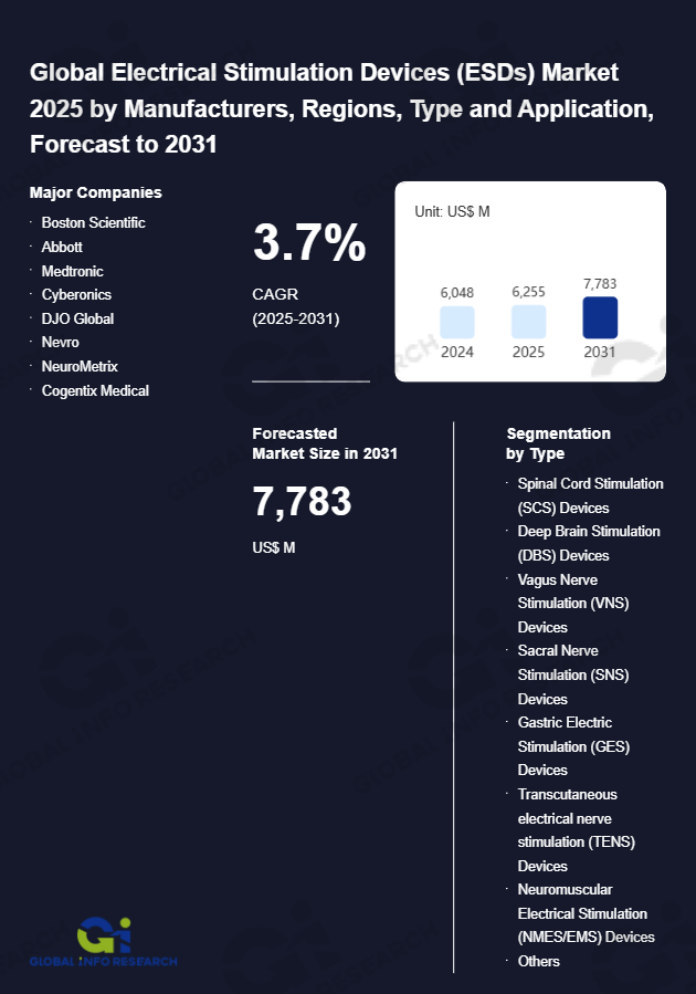 Global Info Research has recently published "Global Electrical Stimulation Devices (ESDs) Market 2026 by Manufacturers, Regions, Type and Application, Forecast to 2032". This report systematically analyzes the current status, future trends (2021-2032), and competitive landscape of the global Electrical Stimulation Devices (ESDs) market. It provides a quantitative analysis from the perspectives of type (Spinal Cord Stimulation (SCS) Devices、 Deep Brain Stimulation (DBS) Devices、 Vagus Nerve Stimulation (VNS) Devices、 Sacral Nerve Stimulation (SNS) Devices、 Gastric Electric Stimulation (GES) Devices、 Transcutaneous electrical nerve stimulation (TENS) Devices、 Neuromuscular Electrical Stimulation (NMES/EMS) Devices、 Others), application (Pain Management、 Neurological and Movement Disorder Management、 Musculoskeletal Disorder Management、 Metabolism & GIT Management (Stomach, Intestine, Pancreas, Digestion, Blood Pressure, Nausea, Vomiting, Gastroparesis, etc.)、 Incontinence Management (Fecal Incontinence, Urinary Incontinence, Urinary Retention)、 Others), regional markets, and major manufacturers (Boston Scientific、 Abbott、 Medtronic、 Cyberonics、 DJO Global、 Nevro、 NeuroMetrix、 Cogentix Medical、 Zynex), comprehensively assessing market opportunities and competitive dynamics.