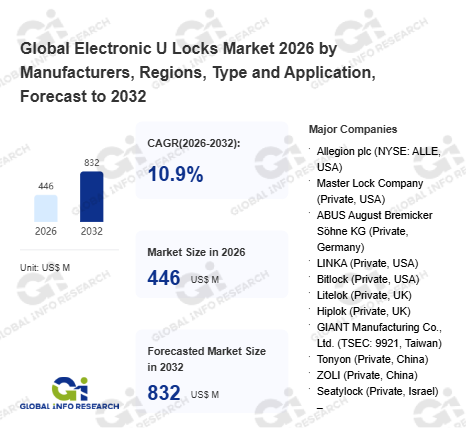 Global Info Research has recently published "Global Electronic U Locks Market 2026 by Manufacturers, Regions, Type and Application, Forecast to 2032". This report systematically analyzes the current status, future trends (2021-2032), and competitive landscape of the global Electronic U Locks market. It provides a quantitative analysis from the perspectives of type (Bluetooth-enabled U-Locks、 NFC / RFID electronic U-Locks、 Keypad/Touchscreen U-Locks、 Biometric / Fingerprint U-Locks、 Hybrid U-Locks), application (Individual Cyclists / Commuters、 Shared Mobility Operators、 Bicycle Rental Companies、 Corporate and Campus Fleets), regional markets, and major manufacturers (Allegion plc (NYSE: ALLE, USA)、 Master Lock Company (Private, USA)、 ABUS August Bremicker Söhne KG (Private, Germany)、 LINKA (Private, USA)、 Bitlock (Private, USA)、 Litelok (Private, UK)、 Hiplok (Private, UK)、 GIANT Manufacturing Co., Ltd. (TSEC: 9921, Taiwan)、 Tonyon (Private, China)、 ZOLI (Private, China)、 Seatylock (Private, Israel) –、 Noké (Private, USA)、 Skylock / Lattis (Private, USA)、 Lock8 (Private, Germany)、 Seesafe (Private, UK)), comprehensively assessing market opportunities and competitive dynamics.