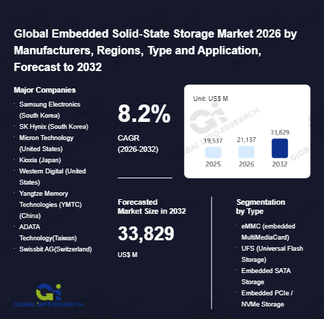 Global Info Research has recently published "Global Embedded Solid-State Storage Market 2026 by Manufacturers, Regions, Type and Application, Forecast to 2032". This report systematically analyzes the global Embedded Solid-State Storage market, providing multi-dimensional insights through type (eMMC (embedded MultiMediaCard)、 UFS (Universal Flash Storage)、 Embedded SATA Storage、 Embedded PCIe / NVMe Storage), application (Electric、 AUTO、 Industrial、 IoT、 Networking & Telecom), regional markets, and major manufacturers (Samsung Electronics (South Korea)、 SK Hynix (South Korea)、 Micron Technology (United States)、 Kioxia (Japan)、 Western Digital (United States)、 Yangtze Memory Technologies (YMTC) (China)、 ADATA Technology(Taiwan)、 Swissbit AG(Switzerland)、 Silicon Motion Technology (Taiwan / United States)、 Longsys Electronics (China)、 BIWIN Storage Technology (China)、 SMART Modular Technologies (U.S.)、 Greenliant Systems(United States)、 Innodisk(Taiwan)、 Virtium (United States)、 Kingston Technology (United States)、 Apacer Technology (Taiwan)、 GigaDevice Semiconductor (China)、 ATP Electronics (Taiwan)、 Integral Memory (United Kingdom)), assessing the market status, trend evolution, and competitive landscape impact from 2021 to 2032.