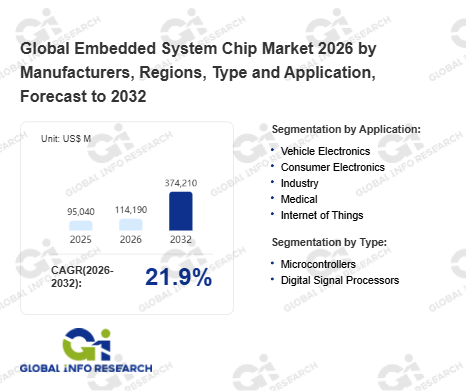 Global Info Research has recently published "Global Embedded System Chip Market 2026 by Manufacturers, Regions, Type and Application, Forecast to 2032". This report systematically analyzes the global Embedded System Chip market, providing multi-dimensional insights through type (Microcontrollers、 Digital Signal Processors), application (Vehicle Electronics、 Consumer Electronics、 Industry、 Medical、 Internet of Things), regional markets, and major manufacturers (NVIDIA、 Intel、 Texas Instruments、 Microchip Technology、 STMicroelectronics、 Renesas Electronics、 NXP Semiconductors、 MediaTek), assessing the market status, trend evolution, and competitive landscape impact from 2021 to 2032.