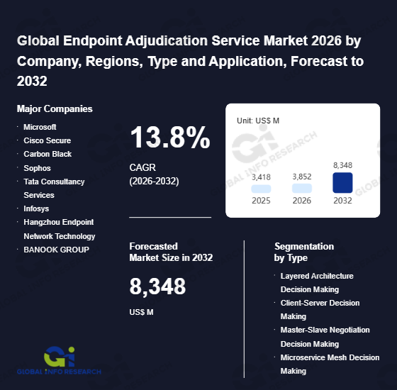 Global Info Research has recently published "Global Endpoint Adjudication Service Market 2026 by Manufacturers, Regions, Type and Application, Forecast to 2032". This report systematically analyzes the current status, future trends (2021-2032), and competitive landscape of the global Endpoint Adjudication Service market. It provides a quantitative analysis from the perspectives of type (Layered Architecture Decision Making、 Client-Server Decision Making、 Master-Slave Negotiation Decision Making、 Microservice Mesh Decision Making), application (Financial Industry、 Biomedicine、 Smart Manufacturing、 Other), regional markets, and major manufacturers (Microsoft、 Cisco Secure、 Carbon Black、 Sophos、 Tata Consultancy Services、 Infosys、 Hangzhou Endpoint Network Technology、 BANOOK GROUP、 ICON plc、 Ethical GmbH、 Advarra、 Sitero、 George Clinical、 Medidata Solutions、 WCG、 Judi for Adjumination、 Clario、 ITREAS、 CISYS LifeSciences、 Crucial Data Solutions、 Voiant、 Exom、 TCell Clinical Services), comprehensively assessing market opportunities and competitive dynamics.