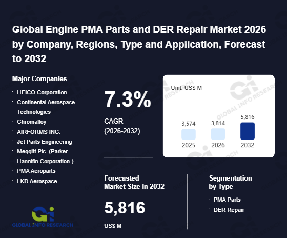 Global Info Research has recently published "Global Engine PMA Parts and DER Repair Market 2026 by Manufacturers, Regions, Type and Application, Forecast to 2032". This report systematically analyzes the global Engine PMA Parts and DER Repair market, providing multi-dimensional insights through type (PMA Parts、 DER Repair), application (Commercial Aviation、 General & Business Aviation), regional markets, and major manufacturers (HEICO Corporation、 Continental Aerospace Technologies、 Chromalloy、 AIRFORMS INC.、 Jet Parts Engineering、 Meggitt Plc. (Parker-Hannifin Corporation.)、 PMA Aeroparts、 LKD Aerospace、 The Timken Company、 Airgroup America. Inc、 Aviation Component Solutions、 Superior Air Parts、 Airforce Turbine Service, Ltd. (ATS)), assessing the market status, trend evolution, and competitive landscape impact from 2021 to 2032.
