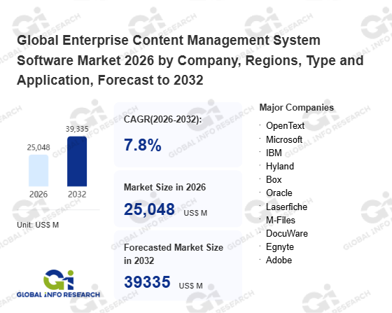 Global Info Research has recently published "Global Enterprise Content Management System Software Market 2026 by Manufacturers, Regions, Type and Application, Forecast to 2032". This report systematically analyzes the global Enterprise Content Management System Software market, providing multi-dimensional insights through type (Cloud-based、 On-premises), application (Large Enterprises、 Small and Medium-sized Enterprises), regional markets, and major manufacturers (OpenText、 Microsoft、 IBM、 Hyland、 Box、 Oracle、 Laserfiche、 M-Files、 DocuWare、 Egnyte、 Adobe、 Everteam Software、 Atlassian、 Newgen Software、 SER Group、 Zoho、 TechnologyOne、 Epicor、 SoftExpert、 Wrike、 Dokmee), assessing the market status, trend evolution, and competitive landscape impact from 2021 to 2032.