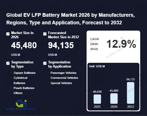Global Info Research has recently published "Global EV LFP Battery Market 2026 by Manufacturers, Regions, Type and Application, Forecast to 2032". This report systematically analyzes the global EV LFP Battery market, providing multi-dimensional insights through type (Square Batteries、 Cylindrical Batteries、 Pouch Batteries、 Others), application (Passenger Vehicles、 Commercial Vehicles、 Special Vehicles), regional markets, and major manufacturers (CATL、 BYD、 LG Energy Solution、 CALB、 Gotion High-Tech、 Samsung SDI、 EVE Energy、 Panasonic、 SVOLT、 REPT Battero、 Tesla、 Farasis Energy、 Lishen Battery、 Tianneng Battery、 A123 Systems、 CBAK、 Phylion Battery、 Xpeng Motors、 Delta Electronics、 Northvolt、 Winston Battery、 Valance Technology、 Honeywell), assessing the market status, trend evolution, and competitive landscape impact from 2021 to 2032.