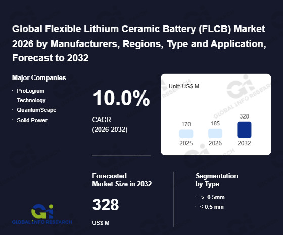 Global Info Research has recently published "Global Flexible Lithium Ceramic Battery (FLCB) Market 2026 by Manufacturers, Regions, Type and Application, Forecast to 2032". This report systematically analyzes the global Flexible Lithium Ceramic Battery (FLCB) market, providing multi-dimensional insights through type (> 0.5mm、 ≤ 0.5 mm), application (Consumer Electronics (Wearables)、 Internet of Things、 Aerospace、 Others), regional markets, and major manufacturers (ProLogium Technology、 QuantumScape、 Solid Power), assessing the market status, trend evolution, and competitive landscape impact from 2021 to 2032.