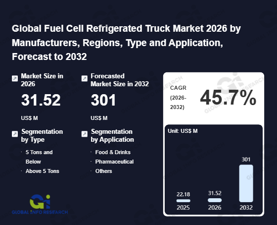 Global Info Research has recently published "Global Fuel Cell Refrigerated Truck Market 2026 by Manufacturers, Regions, Type and Application, Forecast to 2032". This report systematically analyzes the current status, future trends (2021-2032), and competitive landscape of the global Fuel Cell Refrigerated Truck market. It provides a quantitative analysis from the perspectives of type (5 Tons and Below、 Above 5 Tons), application (Food & Drinks、 Pharmaceutical、 Others), regional markets, and major manufacturers (Toyota、 Hyundai、 Bosch、 Feichi Technology、 Foton、 DongFeng、 Yutong、 CIMC), comprehensively assessing market opportunities and competitive dynamics.