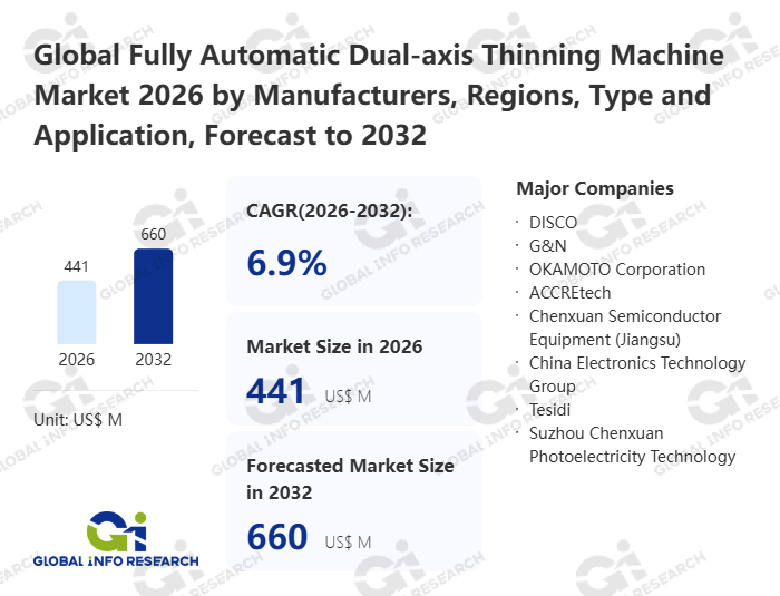 Global Info Research has recently published "Global Fully Automatic Dual-axis Thinning Machine Market 2026 by Manufacturers, Regions, Type and Application, Forecast to 2032". This report systematically analyzes the current status, future trends (2021-2032), and competitive landscape of the global Fully Automatic Dual-axis Thinning Machine market. It provides a quantitative analysis from the perspectives of type (Grinding Thinner、 Polishing Thinner、 Others), application (Semiconductor Manufacturing、 Optical Component Processing、 Others), regional markets, and major manufacturers (DISCO、 G&N、 OKAMOTO Corporation、 ACCREtech、 Chenxuan Semiconductor Equipment (Jiangsu)、 China Electronics Technology Group、 Tesidi、 Suzhou Chenxuan Photoelectricity Technology), comprehensively assessing market opportunities and competitive dynamics.