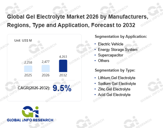 Global Info Research has recently published "Global Gel Electrolyte Market 2026 by Manufacturers, Regions, Type and Application, Forecast to 2032". This report systematically analyzes the current status, future trends (2021-2032), and competitive landscape of the global Gel Electrolyte market. It provides a quantitative analysis from the perspectives of type (Lithium Gel Electrolyte、 Sodium Gel Electrolyte、 Zinc Gel Electrolyte、 Acid Gel Electrolyte), application (Electric Vehicle、 Energy Storage System、 Supercapacitor、 Others), regional markets, and major manufacturers (3M Company (USA)、 Solvay (Belgium)、 Arkema (France)、 Evonik (Germany)、 Ashland (USA)、 Nippon Shokubai (Japan)、 Sekisui Chemical (Japan)、 Mitsubishi Chemical (Japan)、 BASF (Germany)、 Dow Chemical (USA)、 Merck (Germany)、 DuPont (USA)、 Covestro (Germany)、 Vestolit (Mexico)、 Shenzhen Capchem (China)、 Tinci Materials (China)、 LG Chem (South Korea)、 SK On (South Korea)、 Soulbrain (South Korea)、 Dongwha (South Korea)), comprehensively assessing market opportunities and competitive dynamics.