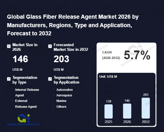 Global Info Research has recently published "Global Glass Fiber Release Agent Market 2026 by Manufacturers, Regions, Type and Application, Forecast to 2032". This report systematically analyzes the global Glass Fiber Release Agent market, providing multi-dimensional insights through type (Internal Release Agent、 External Release Agent), application (Automotive、 Aerospace、 Marine、 Others), regional markets, and major manufacturers (Henkel Adhesives、 AMINO CHEMISTRY LIMITED、 Silibase、 Intermol、 Chem-Trend、 McLube、 DERLTA、 MEIYA、 Deawa、 JUGUAN、 Ababol Products、 Composites Plus、 DOW、 CLAM DESARROLLO), assessing the market status, trend evolution, and competitive landscape impact from 2021 to 2032.