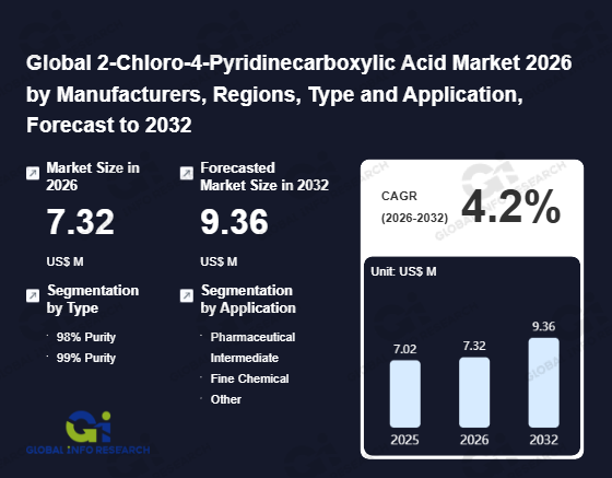 Global Info Research has recently published "Global 2-Chloro-4-Pyridinecarboxylic Acid Market 2026 by Manufacturers, Regions, Type and Application, Forecast to 2032". This report systematically analyzes the global 2-Chloro-4-Pyridinecarboxylic Acid market, providing multi-dimensional insights through type (98% Purity、 99% Purity), application (Pharmaceutical Intermediate、 Fine Chemical、 Other), regional markets, and major manufacturers (YUKI GOSEI KOGYO、 Veer Chemie & Aromatics、 Hebei Yanuo Bioscience、 Hengshui Rayson Chemical), assessing the market status, trend evolution, and competitive landscape impact from 2021 to 2032.