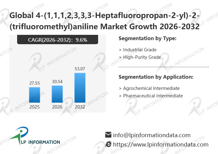 The global 4-(1,1,1,2,3,3,3-Heptafluoropropan-2-yl)-2-(trifluoromethyl)aniline market size is predicted to grow from US$ 27.55 million in 2025 to US$ 53.07 million in 2032; it is expected to grow at a CAGR of 9.6% from 2026 to 2032.