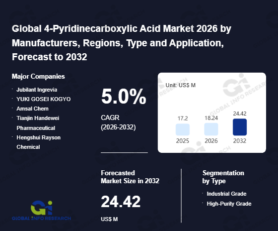Global Info Research has recently published "Global 4-Pyridinecarboxylic Acid Market 2026 by Manufacturers, Regions, Type and Application, Forecast to 2032". This report systematically analyzes the current status, future trends (2021-2032), and competitive landscape of the global 4-Pyridinecarboxylic Acid market. It provides a quantitative analysis from the perspectives of type (Industrial Grade、 High-Purity Grade), application (Pharmaceutical Intermediate、 Fine Chemical), regional markets, and major manufacturers (Jubilant Ingrevia、 YUKI GOSEI KOGYO、 Amsal Chem、 Tianjin Handewei Pharmaceutical、 Hengshui Rayson Chemical), comprehensively assessing market opportunities and competitive dynamics.