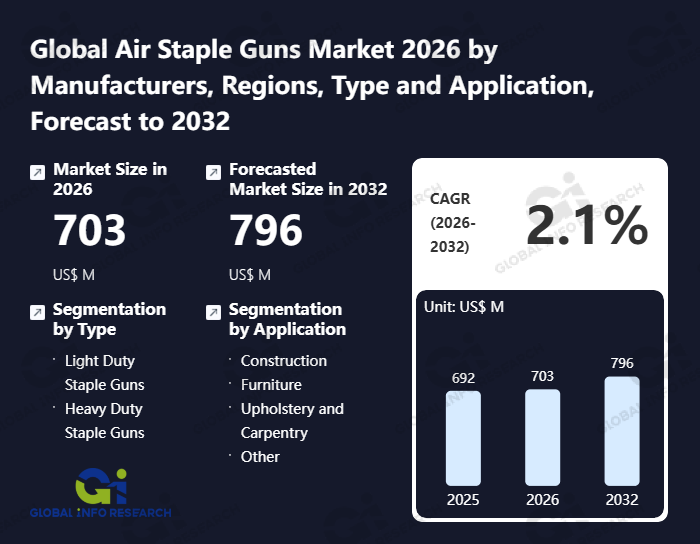 Global Info Research has recently published "Global Air Staple Guns Market 2026 by Manufacturers, Regions, Type and Application, Forecast to 2032". This report systematically analyzes the current status, future trends (2021-2032), and competitive landscape of the global Air Staple Guns market. It provides a quantitative analysis from the perspectives of type (Light Duty Staple Guns、 Heavy Duty Staple Guns), application (Construction、 Furniture、 Upholstery and Carpentry、 Other), regional markets, and major manufacturers (Stanley Black & Decker、 TTI、 Bosch、 Makita、 Kyocera Senco Industrial Tools、 Arrow Fastener、 ITW、 Apex、 KGOC Global、 MAX、 Rongpeng Air Tools、 Acme Staple、 Kaymo Fastener Company、 Apach Tools), comprehensively assessing market opportunities and competitive dynamics.