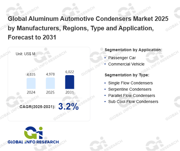 Global Info Research has recently published "Global Aluminum Automotive Condensers Market 2026 by Manufacturers, Regions, Type and Application, Forecast to 2032". This report systematically analyzes the current status, future trends (2021-2032), and competitive landscape of the global Aluminum Automotive Condensers market. It provides a quantitative analysis from the perspectives of type (Single Flow Condensers、 Serpentine Condensers、 Parallel Flow Condensers、 Sub Cool Flow Condensers), application (Passenger Car、 Commercial Vehicle), regional markets, and major manufacturers (Subros、 Denso、 Delphi Automotive、 Robert Bosch GmbH、 MAHLE GmbH、 Hanon Systems、 Valeo、 Modine Manufacturing、 Standard Motor Products、 Keihin、 Calsonic Kansei、 Sanden Philippines、 Air International Thermal Systems、 Reach Cooling、 OSC Automotive、 Japan Climate Systems、 KOYORAD), comprehensively assessing market opportunities and competitive dynamics.