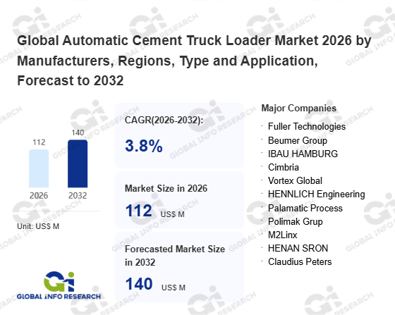 Global Info Research has recently published "Global Automatic Cement Truck Loader Market 2026 by Manufacturers, Regions, Type and Application, Forecast to 2032". This report systematically analyzes the global Automatic Cement Truck Loader market, providing multi-dimensional insights through type (Telescopic Loading Spout、 Robotic Layer Loader、 Others), application (Bulk Cement、 Bagged Cement), regional markets, and major manufacturers (Fuller Technologies、 Beumer Group、 IBAU HAMBURG、 Cimbria、 Vortex Global、 HENNLICH Engineering、 Palamatic Process、 Polimak Grup、 M2Linx、 HENAN SRON、 Claudius Peters、 Joloda Hydraroll), assessing the market status, trend evolution, and competitive landscape impact from 2021 to 2032.