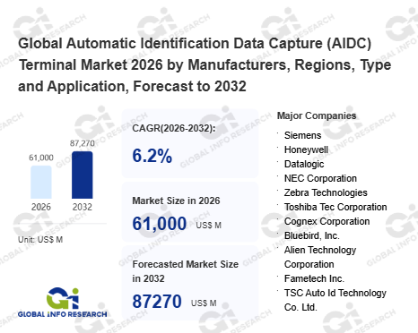 Global Info Research has recently published "Global Automatic Identification Data Capture (AIDC) Terminal Market 2026 by Manufacturers, Regions, Type and Application, Forecast to 2032". This report systematically analyzes the global Automatic Identification Data Capture (AIDC) Terminal market, providing multi-dimensional insights through type (Barcodes Technologies、 Radio Frequency Identification (RFID) Technologies、 Biometric Technologies、 Optical Character Recognition (OCR) Technologies、 Other), application (Retail、 Medical、 Industrial、 Other), regional markets, and major manufacturers (Siemens、 Honeywell、 Datalogic、 NEC Corporation、 Zebra Technologies、 Toshiba Tec Corporation、 Cognex Corporation、 Bluebird, Inc.、 Alien Technology Corporation、 Fametech Inc.、 TSC Auto Id Technology Co. Ltd.、 SATO Worldwide、 Godex International、 Epson、 Impinj, Inc.、 Avery Dennison Corporation、 Microscan System, Inc. (Omron)、 Axicon Auto ID Ltd、 Unitech Electronics Co. Ltd、 Newland、 Urovo Technology、 Prevailtec、 Xi'an Clico), assessing the market status, trend evolution, and competitive landscape impact from 2021 to 2032.
