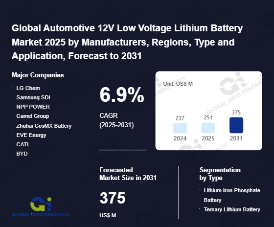 Global Info Research has recently published "Global Automotive 12V Low Voltage Lithium Battery Market 2026 by Manufacturers, Regions, Type and Application, Forecast to 2032". This report systematically analyzes the global Automotive 12V Low Voltage Lithium Battery market, providing multi-dimensional insights through type (Lithium Iron Phosphate Battery、 Ternary Lithium Battery), application (Fuel Vehicles、 Hybrid Vehicles、 Electric Vehicles), regional markets, and major manufacturers (LG Chem、 Samsung SDI、 NPP POWER、 Camel Group、 Zhuhai CosMX Battery、 EVE Energy、 CATL、 BYD、 Hangzhou Skyrich Power、 WANXIANG Group、 Anhui Leadwin New Energy Technology、 Fengfan Co., Ltd、 Shenzhen Kamcy New Energy Products、 Ganfeng Lithium Industry Group、 Shenzhen Center POWER Tech、 Sunwoda Electronic), assessing the market status, trend evolution, and competitive landscape impact from 2021 to 2032.