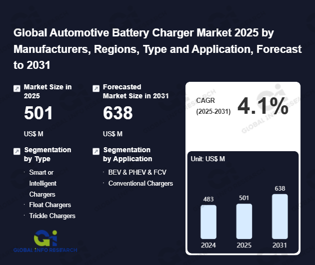 Global Info Research has recently published "Global Automotive Battery Charger Market 2026 by Manufacturers, Regions, Type and Application, Forecast to 2032". This report systematically analyzes the global Automotive Battery Charger market, providing multi-dimensional insights through type (Smart or Intelligent Chargers、 Float Chargers、 Trickle Chargers), application (BEV & PHEV & FCV、 Conventional Chargers), regional markets, and major manufacturers (CTEK Holding AB、 Schumacher Electric Corporation、 Robert Bosch、 Stanley Black & Decker (DeWalt)、 Current Ways Inc.、 Clore Automotive LLC、 NOCO Company、 Battery Tender、 Jiangsu Jianghe、 Hengyuan Dianqi、 Nanjing Super、 Biltema、 Yuasa、 Ansmann、 Energizer、 TecMate、 Associated Equipment、 Projecta、 Defa、 Ring automotive), assessing the market status, trend evolution, and competitive landscape impact from 2021 to 2032.