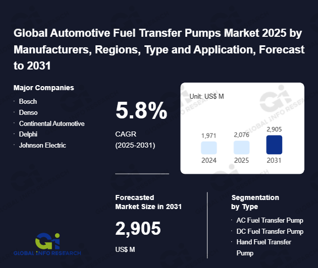 Global Info Research has recently published "Global Automotive Fuel Transfer Pumps Market 2026 by Manufacturers, Regions, Type and Application, Forecast to 2032". This report systematically analyzes the current status, future trends (2021-2032), and competitive landscape of the global Automotive Fuel Transfer Pumps market. It provides a quantitative analysis from the perspectives of type (AC Fuel Transfer Pump、 DC Fuel Transfer Pump、 Hand Fuel Transfer Pump), application (Passenger Car、 Commercial Vehicle), regional markets, and major manufacturers (Bosch、 Denso、 Continental Automotive、 Delphi、 Johnson Electric), comprehensively assessing market opportunities and competitive dynamics.