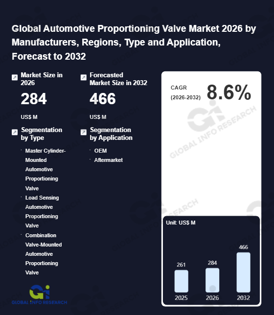 Global Info Research has recently published "Global Automotive Proportioning Valve Market 2026 by Manufacturers, Regions, Type and Application, Forecast to 2032". This report systematically analyzes the current status, future trends (2021-2032), and competitive landscape of the global Automotive Proportioning Valve market. It provides a quantitative analysis from the perspectives of type (Master Cylinder-Mounted Automotive Proportioning Valve、 Load Sensing Automotive Proportioning Valve、 Combination Valve-Mounted Automotive Proportioning Valve), application (OEM、 Aftermarket), regional markets, and major manufacturers (Nachi、 Knorr-Bremse、 WABCO、 Baer Brakes、 ACDelco、 Wilwood Engineering、 General Motors、 Emerson、 Heidts、 Veoneer-Nissin、 Baer Inc、 Danfoss、 Jiangsu Guorui Hydraulic Machinery、 Huai'an SKBT Fluid Technology、 Ningbo Bolev Hydraulics、 Jinzhou Lite Hydraulic Technology、 Shanghai Ruiyin Fluid Technology), comprehensively assessing market opportunities and competitive dynamics.