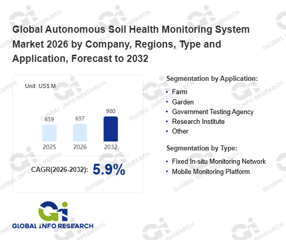 Global Info Research has recently published "Global Autonomous Soil Health Monitoring System Market 2026 by Manufacturers, Regions, Type and Application, Forecast to 2032". This report systematically analyzes the global Autonomous Soil Health Monitoring System market, providing multi-dimensional insights through type (Fixed In-situ Monitoring Network、 Mobile Monitoring Platform), application (Farm、 Garden、 Government Testing Agency、 Research Institute、 Other), regional markets, and major manufacturers (METER Group, Inc.、 CropX Technologies、 Xsupra、 Growa.ai、 Agera、 Sentinum、 LI-COR、 PsiBorg、 AdvanceTech India、 Hunan Rika Electronic Tech Co.,Ltd.、 Honde Technology Co., Ltd.、 Shenzhen C2S Technology Co., Ltd.), assessing the market status, trend evolution, and competitive landscape impact from 2021 to 2032.