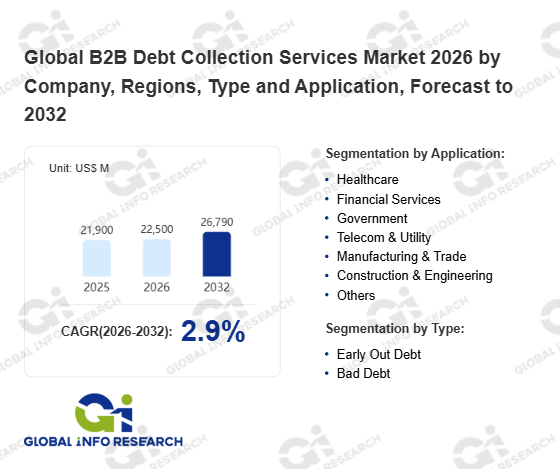 Global Info Research has recently published "Global B2B Debt Collection Services Market 2026 by Manufacturers, Regions, Type and Application, Forecast to 2032". This report systematically analyzes the global B2B Debt Collection Services market, providing multi-dimensional insights through type (Early Out Debt、 Bad Debt), application (Healthcare、 Financial Services、 Government、 Telecom & Utility、 Manufacturing & Trade、 Construction & Engineering、 Others), regional markets, and major manufacturers (Encore Capital Group、 EOS Group、 PRA Group、 Intrum、 Transworld Systems Inc (TSI)、 Midland Credit Management、 TCM Group、 GC Services、 Hoist Finance、 Arrow Global、 Creditreform、 Axactor、 B2Holding、 KRUK Group、 Lowell、 Arvato (Bertelsmann Group)、 Alorica、 Cerved、 iQera、 iQor、 IC System、 coeo Inkasso GmbH、 Altus GTS Inc.、 Weltman, Weinberg & Reis、 Atradius Collections、 Bierens Debt Recovery Lawyers、 Link Financial、 UNIVERSUM Group、 Prestige Services Inc (PSI)、 Asta Funding), assessing the market status, trend evolution, and competitive landscape impact from 2021 to 2032.