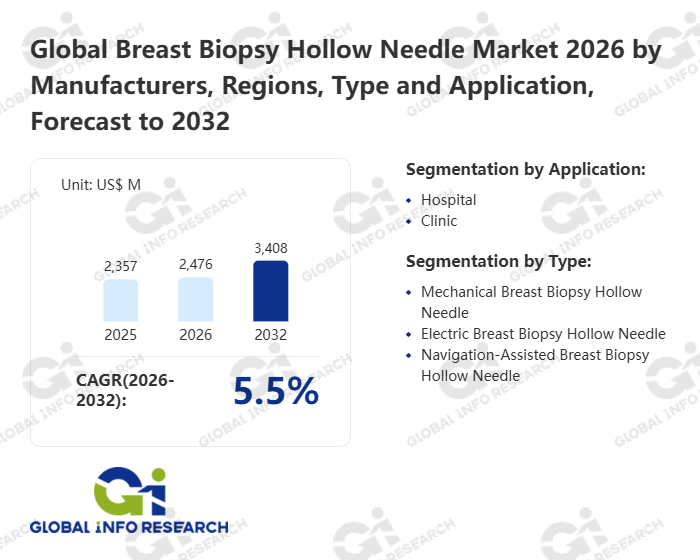 Global Info Research has recently published "Global Breast Biopsy Hollow Needle Market 2026 by Manufacturers, Regions, Type and Application, Forecast to 2032". This report systematically analyzes the current status, future trends (2021-2032), and competitive landscape of the global Breast Biopsy Hollow Needle market. It provides a quantitative analysis from the perspectives of type (Mechanical Breast Biopsy Hollow Needle、 Electric Breast Biopsy Hollow Needle、 Navigation-Assisted Breast Biopsy Hollow Needle), application (Hospital、 Clinic), regional markets, and major manufacturers (Mammotome、 Vector Medical、 Johns Hopkins Medicine、 Becton, Dickinson、 Susan G. Komen、 Radiologyinfo、 Trivitron Healthcare、 Shanghai Xiuneng Medical Instrument、 Chongqing Xishan Science and Technology、 Argon Medical Devices、 Curaway Medical、 Hologic、 Medax、 Segimedical、 Germanmedtech), comprehensively assessing market opportunities and competitive dynamics.