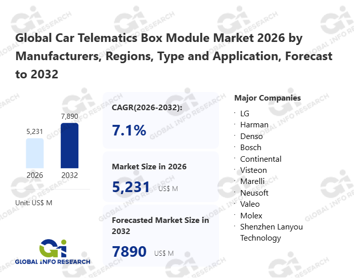 Global Info Research has recently published "Global Car Telematics Box Module Market 2026 by Manufacturers, Regions, Type and Application, Forecast to 2032". This report systematically analyzes the global Car Telematics Box Module market, providing multi-dimensional insights through type (2G、 3G、 4G、 5G、 Others), application (Passenger Vehicle、 Commercial Vehicle), regional markets, and major manufacturers (LG、 Harman、 Denso、 Bosch、 Continental、 Visteon、 Marelli、 Neusoft、 Valeo、 Molex、 Shenzhen Lanyou Technology、 Flaircomm Microelectronics、 Ficosa、 Huawei、 Xiamen Yaxon Network、 Panasonic、 Beijing Jingwei Hirain Technologies、 GosuncnWelink、 Qiming Information Technology、 Huizhou Desay SV Automotive、 Hangzhou Hopechart IoT Technology、 Wieson Automotive), assessing the market status, trend evolution, and competitive landscape impact from 2021 to 2032.