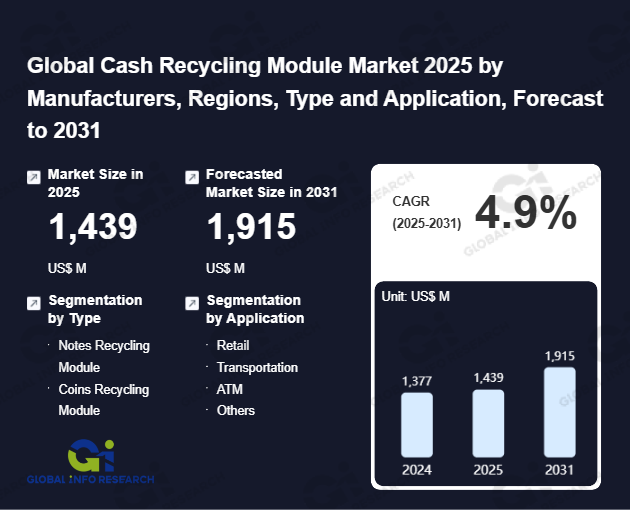 Global Info Research has recently published "Global Cash Recycling Module Market 2026 by Manufacturers, Regions, Type and Application, Forecast to 2032". This report systematically analyzes the global Cash Recycling Module market, providing multi-dimensional insights through type (Notes Recycling Module、 Coins Recycling Module), application (Retail、 Transportation、 ATM、 Others), regional markets, and major manufacturers (CMSI、 Glory、 Hitachi、 Disko、 OKI Global、 KEBA、 ARCA、 CPI、 CI Tech、 AMCA、 Hyosung、 GRGBanking、 Fujitsu、 Diebold Nixdorf、 MoneyGuard、 Zara Zaman、 AIM Solution、 CASHMAG、 Recycling tech、 Hartfiel Automation、 Crane Payment Innovations), assessing the market status, trend evolution, and competitive landscape impact from 2021 to 2032.
